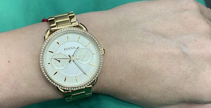 Корпус и браслет модели из нержавеющей стали, безель усыпан кристаллами, на перламутровом циферблате расположены два дополнительных окошка с окошком с днем недели и текущей датой.