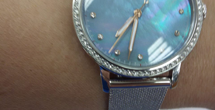 Циферблат перламутрового цвета, стрелки покрыты люминесцентным составом, что обеспечит вам более легкое считывание информации в вечернее время.
