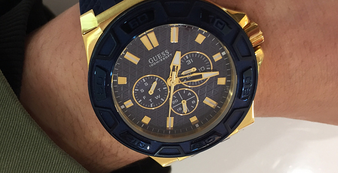 Мужская модель часов GUESS W1049G2 из коллекции Legacy с силиконовым ремешком, синим циферблатом с тремя дополнительными окошками отображающими текущую дату  и день недели, диапазон времени в 12/24 формате.