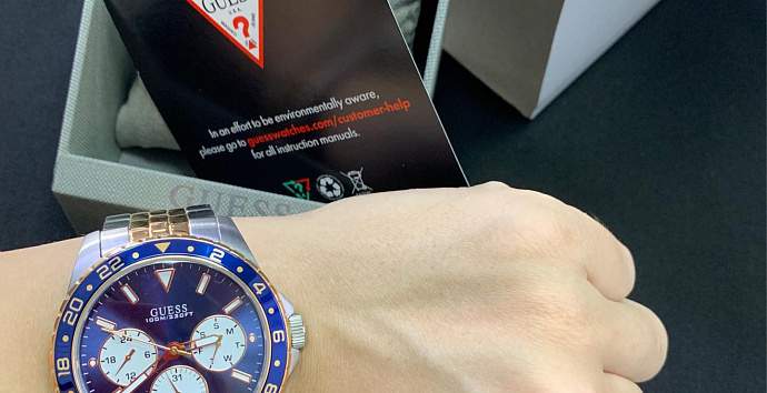 Модель часов с кварцевым механизмом с тремя дополнительными окошками на циферблате, с обозначением формата времени 12-ти и 24-х, текущим днем недели и датой.