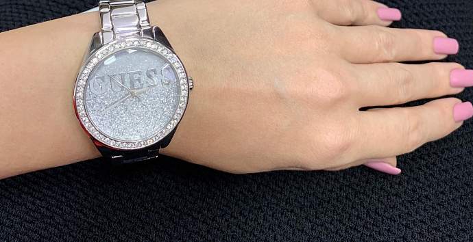 Корпус и браслет из нержавеющей стали, циферблат усыпан кристаллами и украшен логотипом бренда.