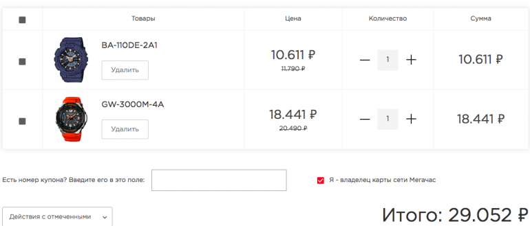 Также добавить в корзину вы можете товар из карточки товара (нажав на часы, вам откроются полные характеристики, инструкции, комплектация), также возможно внесение промокода в соответствующее поле. В случае если вы являетесь клиентом компании Мегачас и владеете скидочной картой, вы можете активировать скидку по ней в карточке товара, лито на последнем этапе в Корзине при оформлении покупки. В данном случае предъявите свою карту в нашем магазине при покупке часов ( в случае самовывоза), если часы вам доставляет курьер, карту можно не предоставлять.